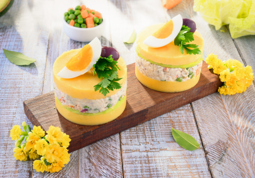 Descubre la magia de la causa limeña o causa peruana de pollo en este caso, un plato emblemático de la gastronomía peruana que encanta con su sabor único y su colorida presentación. Originaria de la región costera de Lima, esta delicia culinaria combina suaves capas de puré de papas amarillas sazonadas con ají amarillo y jugo de limón, creando una experiencia gastronómica que deleita tanto al paladar como a la vista.