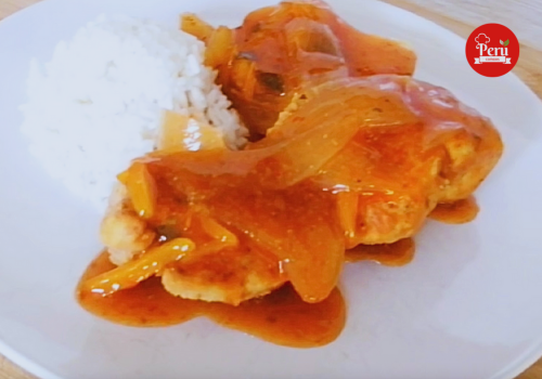 El escabeche peruano es pollo frito marinado en salsa agridulce de vinagre, cebolla